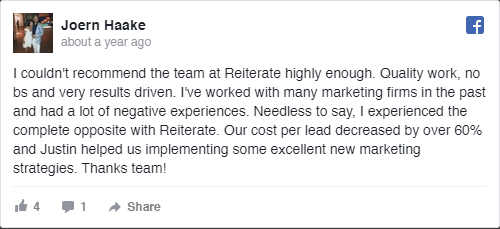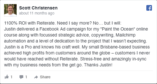 A quick bit of background about me… Before Reiterate, I was the Digital Marketing Manager for a large state-wide multimillion-dollar brand. We were outsourcing our Facebook/Instagram marketing strategy to a programmatic buying agency and seeing lacklustre results. So, I took it in-house to see how I could fare against the big guys… And well… In 3-months my campaign starting outperforming theirs by over 10-times. That’s 10X more sales revenue. Since then, I’ve dedicated all my time to learning the tools and techniques that make a digital funnel produce consistent results time and time again. I’ve dedicated myself to learning how to create Facebook campaigns that eliminate wastage, and only serve adverts to prospects that are most qualified to buy.